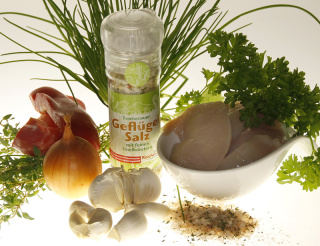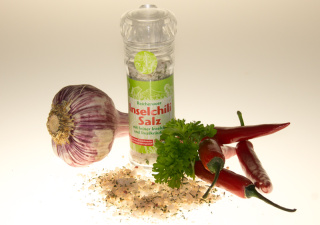 Zutaten: Meersalz, Chili, Kerbel, Petersilie, Schnittlauch, Salbei, Knoblauch, Zwiebeln.