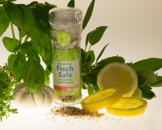Zutaten: Meersalz, Dill, Rosmarin, Salbei, Minze, Zitronenschale, Petersilie, Schnittlauch, Zwiebeln, Knoblauch, Reismehl, Schinusbeere (Rosa Pfeffer), Kurkuma, Traubenzucker.
