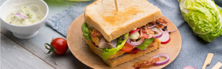 Dann mit Tomaten, Radieschen, Äpfeln, Salat, Zwiebelringen, Kresse und Bacon belegen. Jeweils 2 belegte Toasts aufeinander türmen, mit einem unbelegten Toast abschließen und sofort genießen.