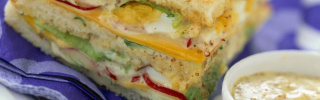 4 Scheiben auf der Arbeitsfläche auslegen und dünn mit Senfcreme bestreichen. Mit Gurken, Radieschen, Salat und je einer Scheibe Käse belegen. Darauf wiederum einen Toast legen und leicht andrücken. Mit Senfsauce bestreichen, mit Käse, Ei, übrigen Radieschen und Gurke belegen. Übrige Toastscheiben mit restlicher Senfsauce bestreichen und auflegen. Mit Spießchen fixieren und zum Servieren in Dreiecke schneiden.