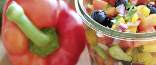 3. Die Paprika vierteln, entkernen und würfeln. Die Bauern-Gurke halbieren und in ca. 0,5 cm dicke Scheiben schneiden.