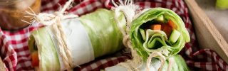 8 einzelne Eisbergsalat-Blätter vom Kopf ablösen. Die äußeren Blätter lassen sich meist leicht abtrennen. Die inneren Blätter lassen sich unter fließendem Wasser einfacher vom Kopf lösen. Die Blätter mit der Wölbung nach unten auf den Arbeitstisch legen. Alle Blätter leicht salzen. Erdnusssauce nicht zu dick und bis etwa 5 cm vom Rand auftragen. Darauf eine Scheibe Tofu und ca. 3 Stück von jeder marinierten Gemüsesorte, sowie frischen Koriander stapeln. Den unteren Rand der Blätter darüber falten, dann vorsichtig und eng aufrollen. Mit einer Schnur bzw. einem Zahnstocher fixieren. Die überstehenden Enden des Wraps abschneiden. Die restliche Sauce als Dip verwenden!