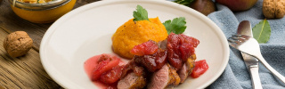 Währenddessen die Apfel-Pflaumensauce in die Pfanne gießen und den Bratsatz damit lösen. Entenbrüste aus der Alufolie nehmen, in 1,5 cm breite Scheiben schneiden, mit der Apfel-Pflaumen-Sauce auf vorgewärmte Teller geben und genießen.