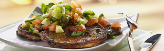 Für die Salsa die Tomaten waschen, vierteln entkernen und fein würfeln. Frühlingszwiebeln putzen, waschen und fein hacken. Gurke schälen, längs halbieren, die Kerne entfernen und das Fruchtfleisch fein würfeln. Kräuterblättchen abzupfen, fein schneiden. Alles mischen. Öl unterrühren. Mit Salz, Limettensaft und Tabsco pikant abschmecken.