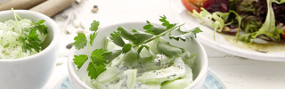 Für den Gurkensalat: Die Gurke schälen, halbieren und das Kerngehäuse mit einem Esslöffel herauskratzen. Die Gurke in ca. 0,3 cm dicke Scheiben schneiden, salzen und ca. 15 min stehen lassen. Anschließend die Flüssigkeit abgießen. Den Schnittlauch und die Pimpernelle fein schneiden und unter den Schmand geben. Mit dem Essig abschmecken und unter die Gurken geben. Gegebenenfalls noch etwas nachsalzen.