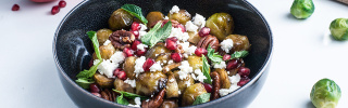 Wenn der Rosenkohl fast fertig ist, die Pekannüsse dazugeben und weitere 5 Minuten backen bis auch die Pekannüsse angeröstet sind. Dabei die Nüsse im Auge behalten, damit sie nicht zu dunkel werden! Den Granatapfel entkernen, Feta zerbröseln und die Minze kleinhacken.