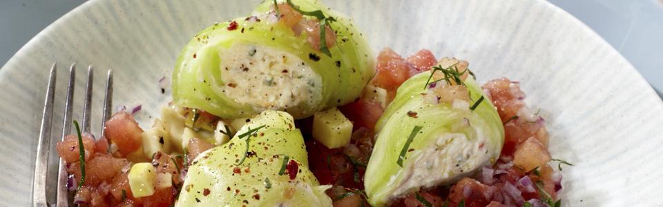 Die Gurke schälen und mit einem Sparschäler längs in dünne, lange Streifen schneiden. Die Kerne übrig lassen. Die Streifen salzen und ca. 10 Minuten in Wasser ziehen lassen. Anschließend trocken tupfen und pro Portion etwa 8 Scheiben überlappend auf Frischhaltefolie nebeneinander legen.