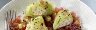 Das Tomatengemüse auf Tellern anrichten. Die Röllchen dritteln und auf dem Tomatengemüse platzieren. Mit Piment d´Espelette und Basilikum bestreuen und mit dem übrigen Öl beträufelt servieren.