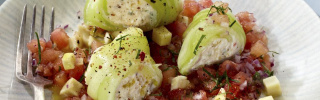 und Piment d´Espelette abschmecken. Die Masse jeweils auf den unteren Teil der Gurkenstreifen setzen und einrollen. Mindestens 1 Stunde kalt stellen.