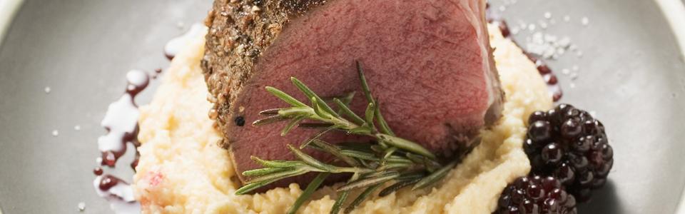 Für das Püree den Sellerie und die Kartoffeln schälen und in Würfel schneiden. In Salzwasser ca. 20 Minuten weich kochen. Anschließend abgießen, durch die Kartoffelpresse drücken und gut ausdampfen lassen. Die heiße Milch und 2 EL Butter unterrühren. Mit Salz, Pfeffer und Muskat abschmecken. Die restliche kalte Butter unter die Sauce rühren, nicht mehr kochen lassen. Die Brombeeren zugeben, mit Salz und Pfeffer abschmecken. Das Hirschkarree aus dem Ofen nehmen und etwas ruhen lassen. In vier Stücke schneiden und auf das Selleriepüree setzen. Die Brombeersauce um das Püree herum träufeln und mit Rosmarin garniert servieren.