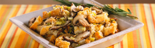 Das Baguette in Scheiben schneiden und in eine große Schüssel legen. Den Rosmarin abbrausen, trocken schütteln, von zwei Zweigen die Nadeln abstreifen und fein hacken. Den Lauch längs halbieren, waschen, putzen und in dünne Scheiben schneiden. Die Shiitake und Egerlinge putzen und in Scheiben schneiden. Den Knoblauch abziehen und fein hacken.
