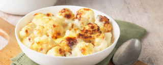 Den Backofen mit Umluft auf 200 Grad Celsius vorheizen. 4 Portions-Auflaufformen ausbuttern. Den Blumenkohl abbrausen, in kleine Röschen teilen und in 3/3 Salzwasser ca. 2 Minuten blanchieren. Abschrecken, gut abtropfen lassen und auf die Förmchen verteilen.
