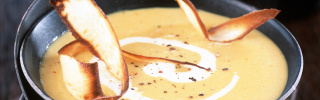 Pastinaken, Kartoffeln, Möhre, Zwiebel und Knoblauch schälen. Von den Pastinaken für die Chips längs etwa 12 schöne, dünne Scheiben abschneiden und beiseitelegen. Das übrige Gemüse würfeln und im heißen Öl 2-3 Minuten farblos anschwitzen. Die Brühe angießen, salzen, pfeffern und etwa 20 Minuten leise weich köcheln lassen.