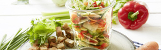 Löffelweise in das Bügelglas füllen, die Croutons darauf verteilen und verschließen.
