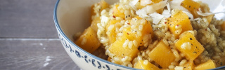 Die Steckrübe würfeln, die Zwiebel und Knoblauch fein hacken. Alles zusammen in einem Topf im Öl 2-3 Minuten anschwitzen. Den Reis kurz mitdünsten, dann mit Brühe bedecken.